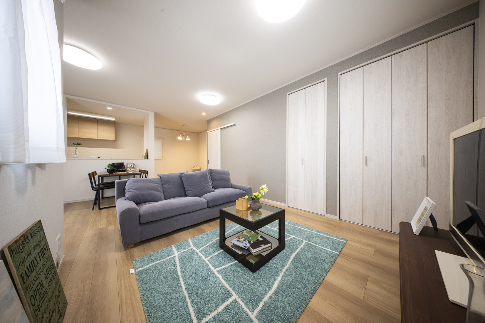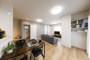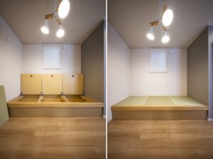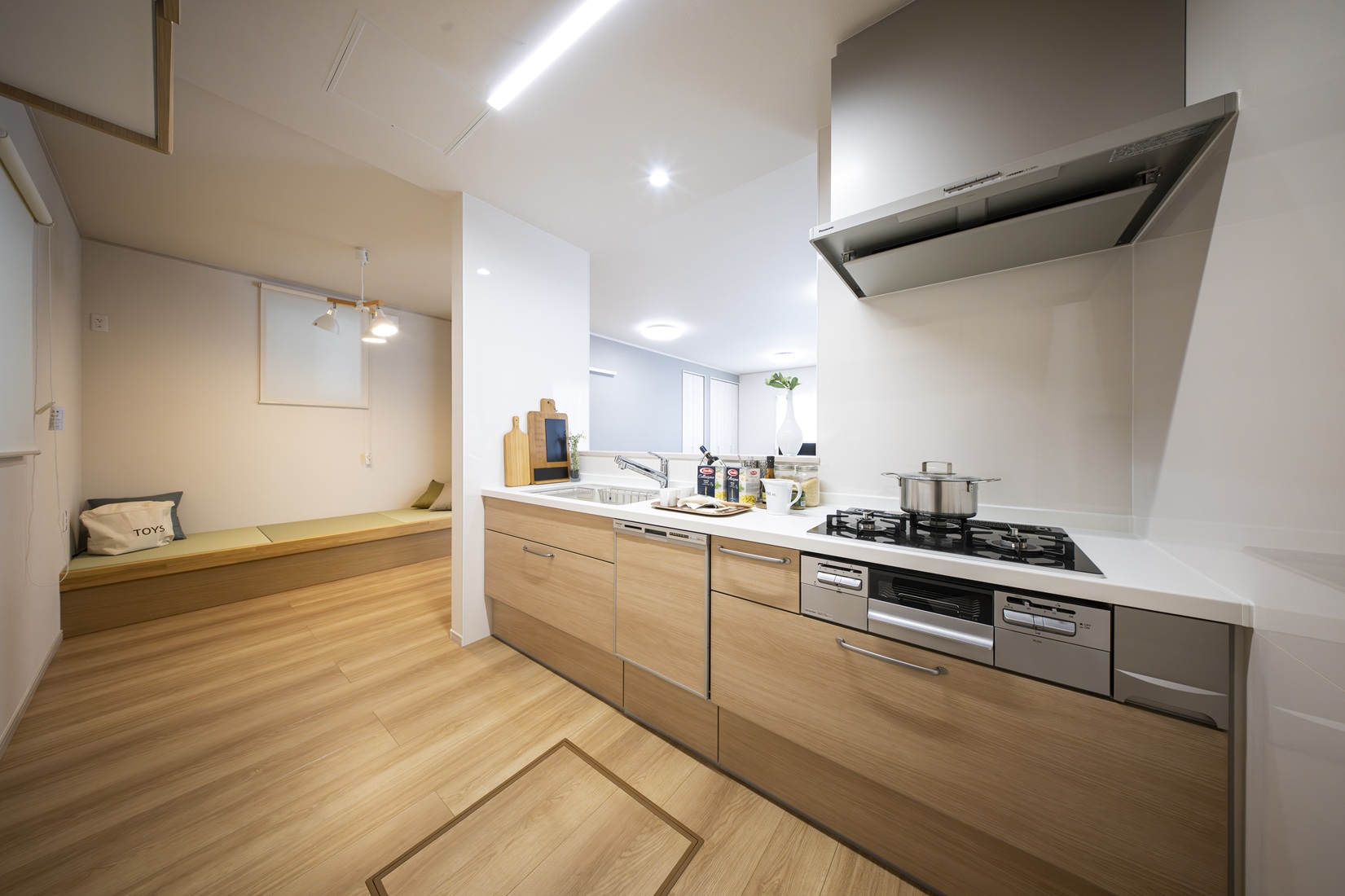 22帖の広々LDKに下部収納になっているおしゃれなタタミコーナーを設計したモデルハウス。