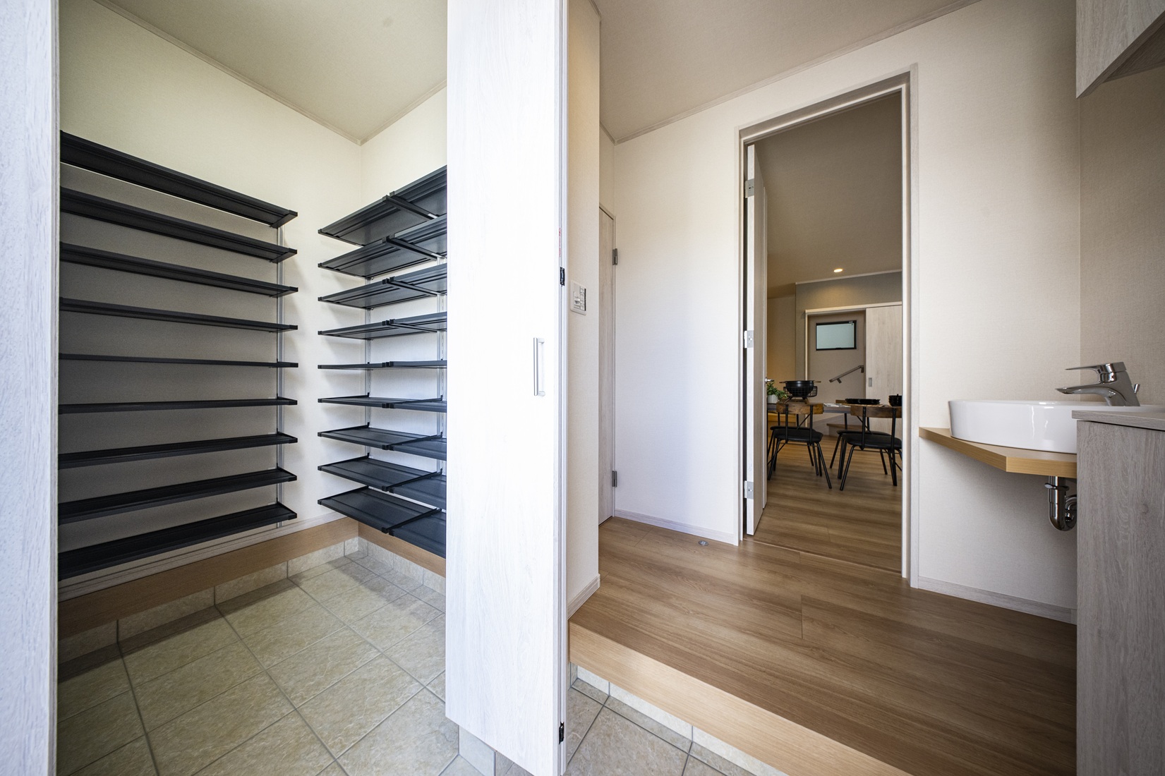 大人気のシューズクローゼットから主寝室のウォークインクローゼットをはじめ、玄関収納にリビングのワイド収納に2階ホールの収納、各居室の収納にオープンロフトに2階洗面室の可動棚まで、たっぷりの収納にこだわった、しまうのが上手に行える家になっています。
