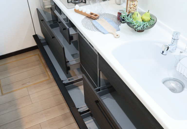 奥の方の調理器具なども出し入れしやすいスライド式収納。