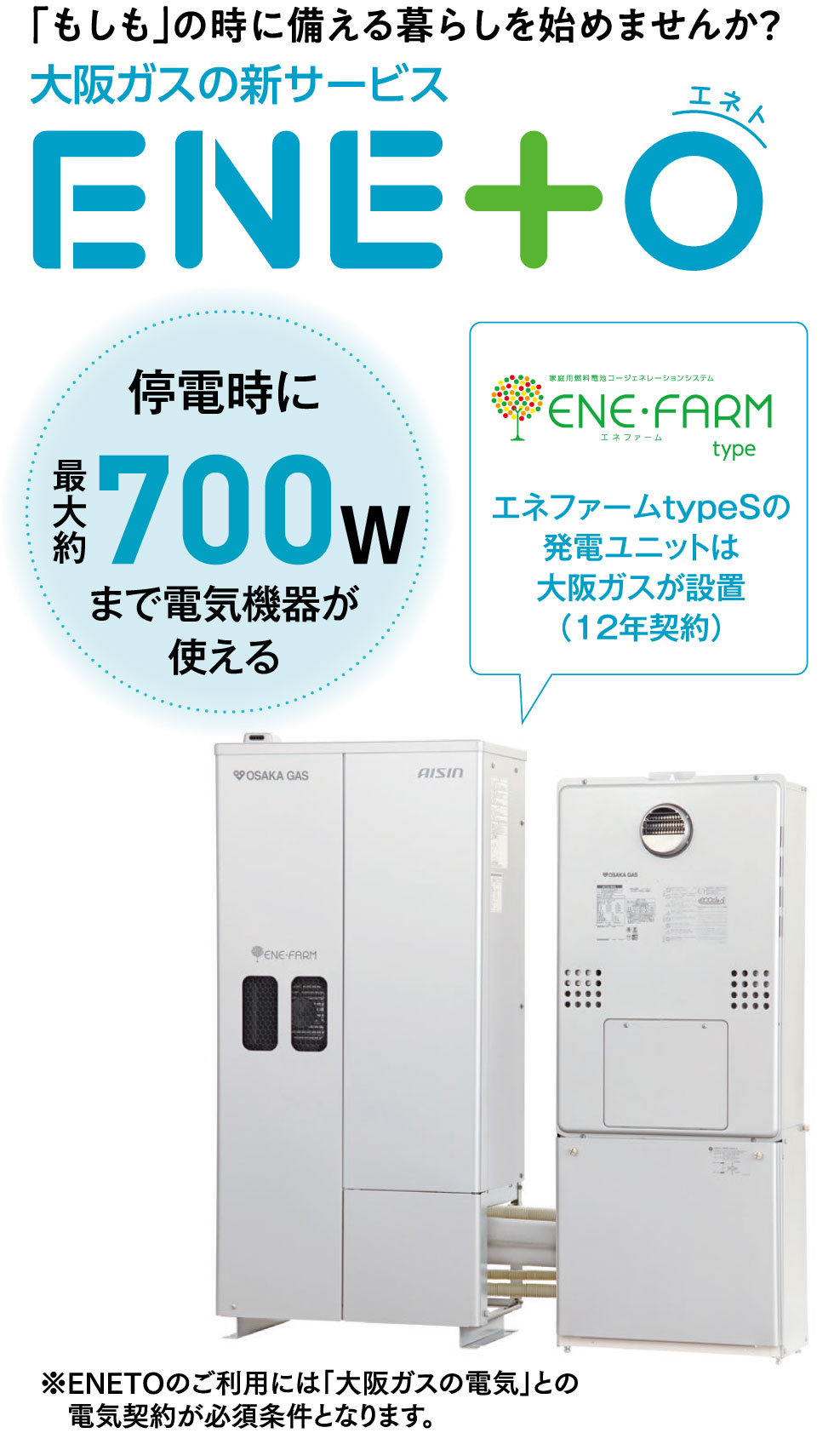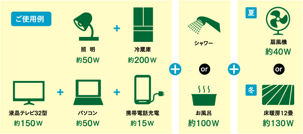 ※数値は定格消費電力の一例です。実際の消費電力は、製品の種類、使用方法により異なります。リモコンで電力消費量を確認しながら一つずつおつなぎください。※バックアップ熱源機の消費電力を含むため、実際に停電時自立発電専用コンセントでご使用いただける発電出力が700W以下になる場合があります。(燃料電池発電ユニットとバックアップ熱源機をセットで設置した場合)※断水時は給湯をお使いいただけません。※冷蔵庫等の一部の家電は機種によっては使用できないことがあります。※既設の給湯器にエネファームを後付け設置される場合、停電時のお湯の使用には停電時自立発電専用コンセントから給湯器への給電が必要です。