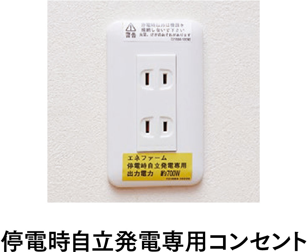エネファームが発電中であれば、災害などによる停電時にも発電を継続。確保した最大約700Wの電力を停電時自立発電専用コンセントからご利用いただけます。お風呂やシャワー、床暖房など普段通りに使えるので災害時の安心感が違います。