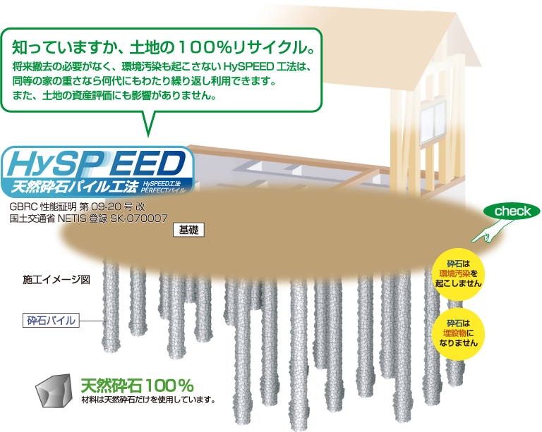 硬化剤を一切使用しない天然砕石パイル工法「HySPEED 工法」は、