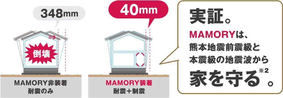 ※2 2017年1月実施の京都大学防災研究所における実大実験において、熊本地震前震級の地震波1回と、本震級の地震波2回を加えても、MAMORYを装着した耐震等級3相当の試験体は倒壊※3しないことを実証。上記は本震1回目時の実験イメージ図。