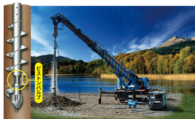 新技術のピストンバルブ(先端ドリル部分)で施工材(砕石)を突き固めます。ピストンバルブのハンマー転圧機能により、従来の施工時間を大幅に削減可能。砕石杭施工後は基礎工事へと、すぐに取り掛かれます。