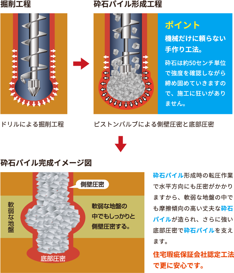 砕石パイルと現地盤で複合的に面全体で建物を支えるので安定した強さがある。