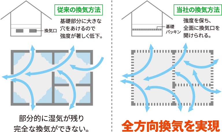 基礎パッキンを使用し、強度を保ちつつ全面に換気口を設けることで、全方向換気を実現しました。