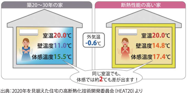 断熱性能の違いによって、室内温度は同じでも体感温度が変わります。断熱性能が高い住まいでは、外気の影響での壁の表面温度の変化を抑えることができますが、断熱性能が低いと外気によって壁の表面温度も大きく影響を受けxます。体感温度は、室内温度と壁の表面温度を足して2で割った値が目安とされています。