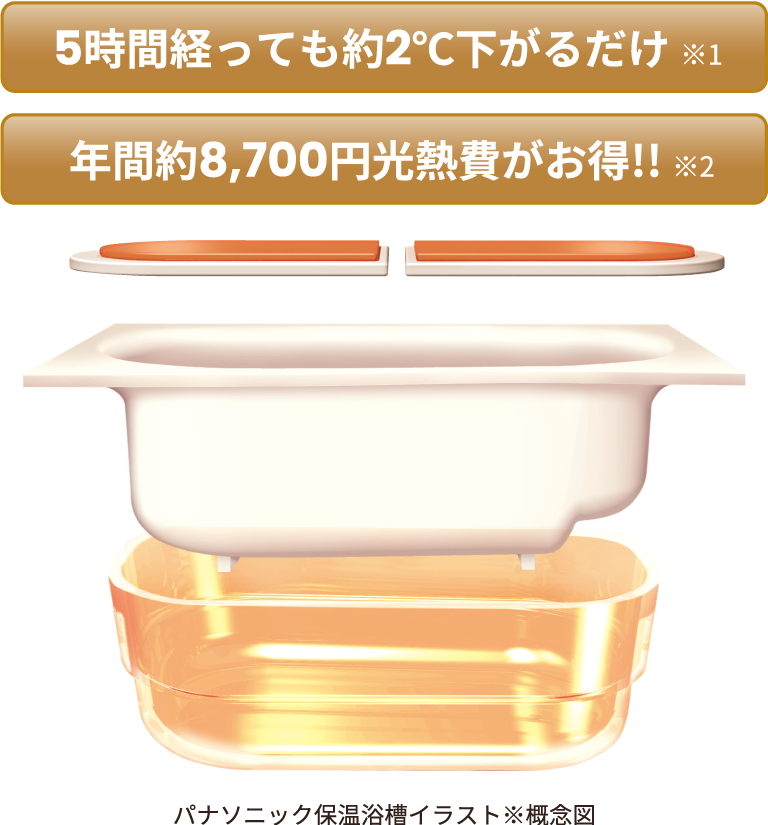 (リクシル・トクラス・パナソニック)いずれも、保温タイプの浴槽を採用。断熱材で浴槽を包み、高い保温効果を発揮します。追い焚き回数を減らし、年間光熱費を節約できます。