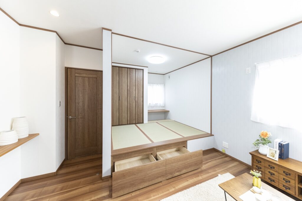 リビングの一角に、畳コーナーを作りたい方なら、畳コーナーを小上がりにして、その段差をまるごと収納スペースにするのがおすすめ。