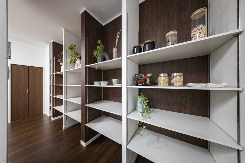 収納家具をあとから置くと、どうしてもお部屋がデコボコして圧迫感が出ちゃうわよね。 そこでおすすめなのが、最初から壁と一体化させて作る「壁面収納」!モノがたくさん入るのはもちろんだけど、「あえて扉を作らない(見せる収納)」というスタイルもおすすめ。