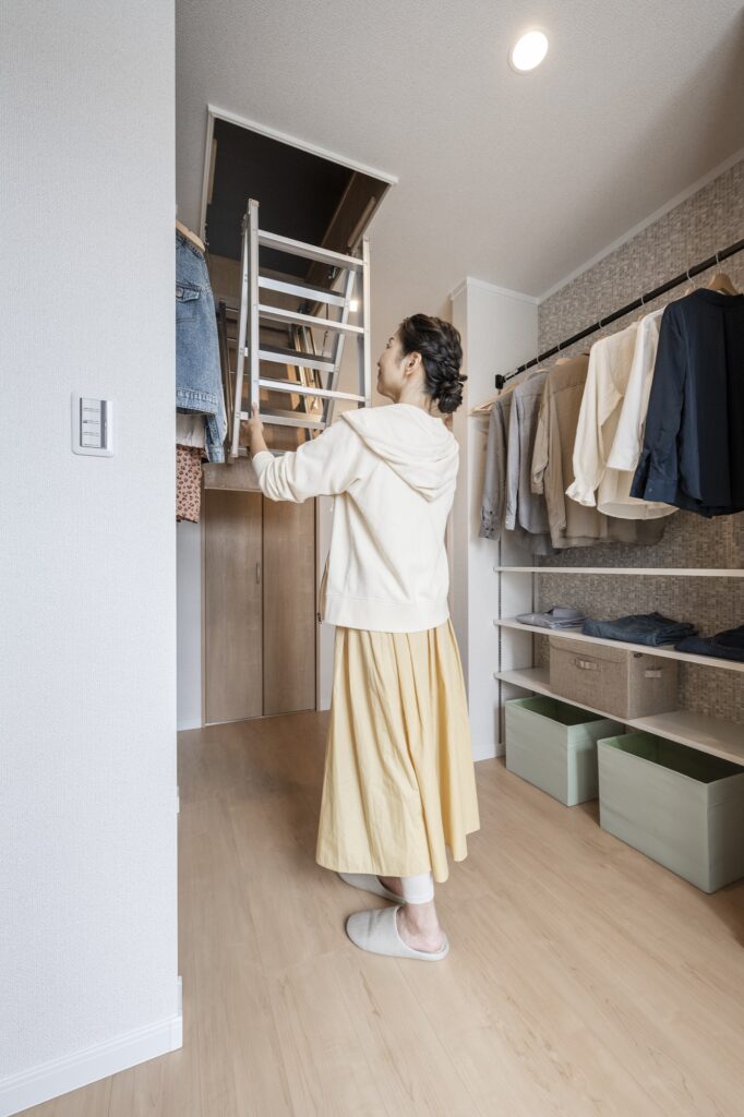 最後は、屋根の下の空間を利用した「小屋裏収納」よ。春にはひな人形や五月人形、冬にはクリスマスツリーやファンヒーター。 それに、サイズアウトしたけれど下の子のために取っておきたい子供服や、幼稚園で作った思い出の作品たち。そういった「出番待ち」のアイテムを小屋裏にしまえば、普段使うクローゼットにも空きを作っておくことができるわよ^^