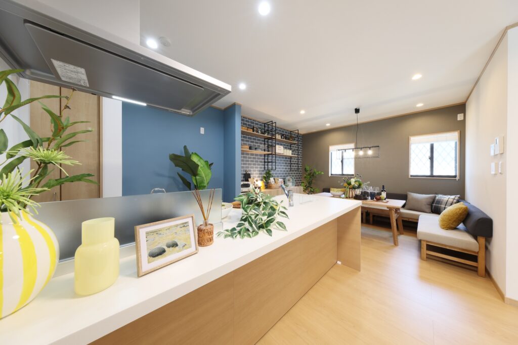 ブルーのアクセントクロスや見せる収納もおしゃれで、カフェのような心地よさ。