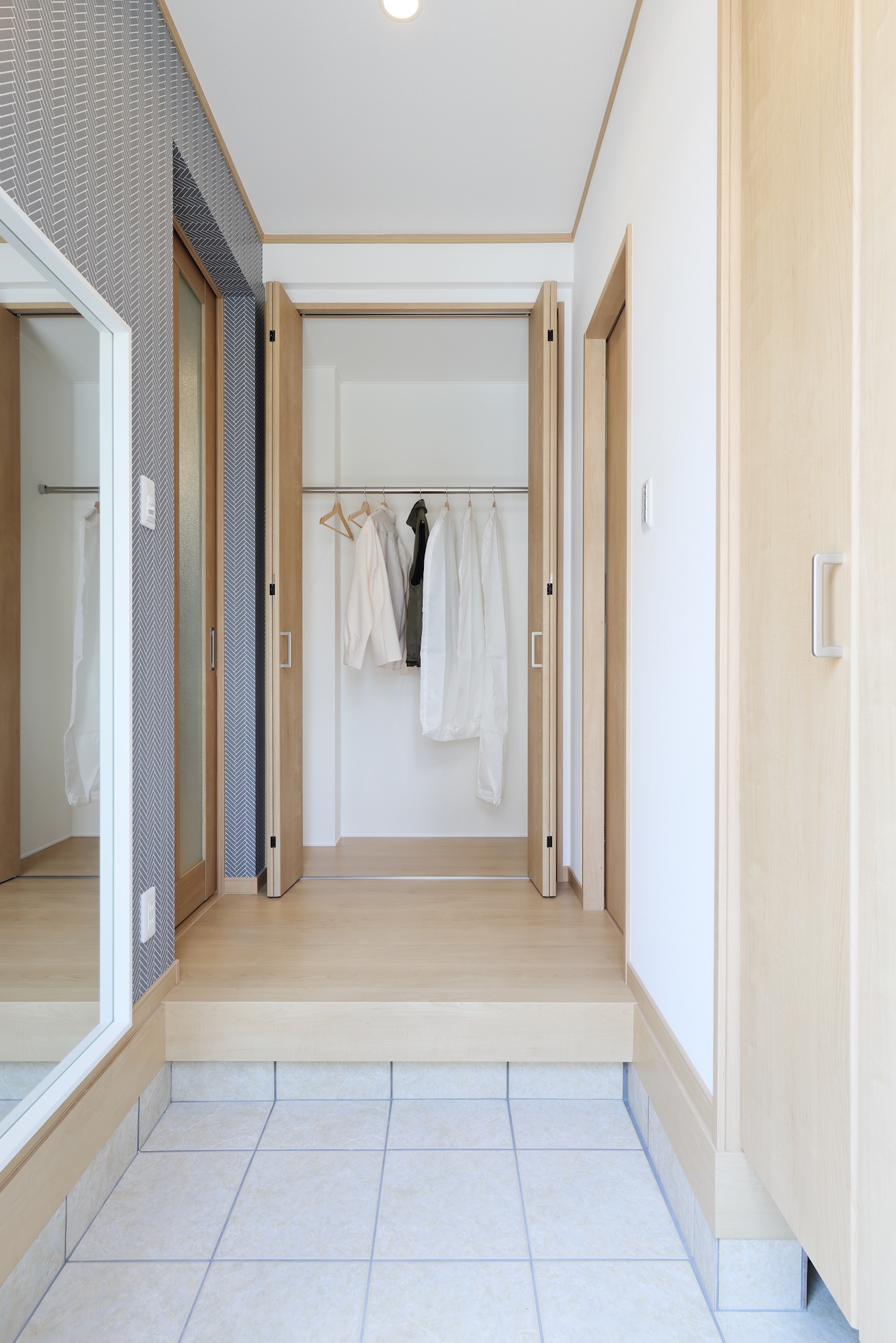 まずは玄関。ここにはコートやお出かけグッズをしまえるクローゼットがあるの。帰ってきてすぐに上着やバッグを掛けられるから、リビングが散らからなくて嬉しいわよね。