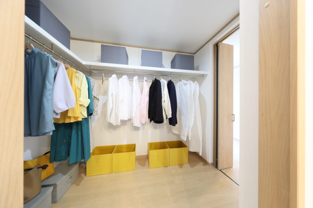 主寝室と廊下の2方向から入ることができるので、例えば夜勤明けでぐっすり眠っているパパの横を通らずに廊下から収納できるのよ。
