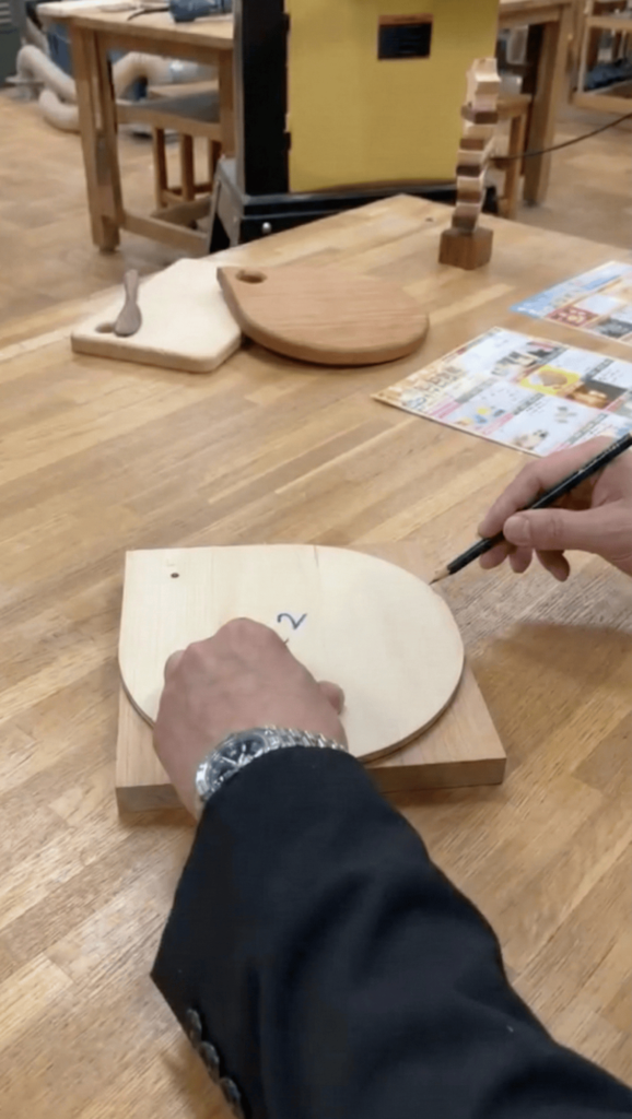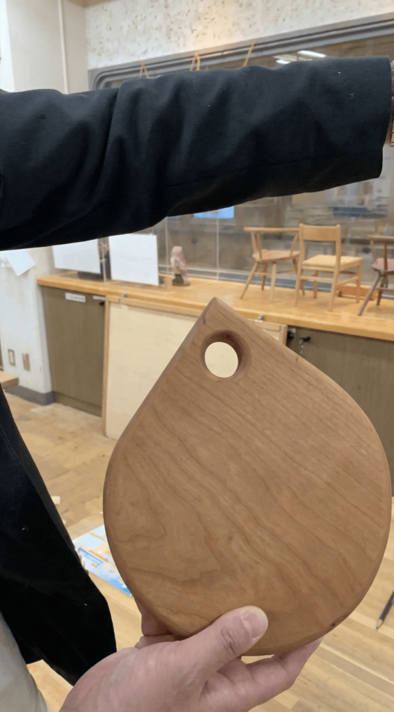 スタッフさんのサポートと、森本社長の全集中のおかげで、無事にボードに穴を開ける作業までクリア!今回は時間の都合でここまでだったけれど、本来ならこの後、はじめに見せてもらった見本のように、スベスベになるまで木を磨いておしゃれなカッティングボードに仕上げていくそうよ^^