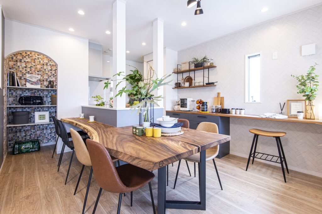 見た目もとっても素敵な、キッチン前に設けた無垢材の一枚板のダイニングテーブル。