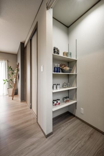 冷蔵庫を置ける大きなパントリーがあり、ロールスクリーンで中が隠せるのも嬉しいポイントよ。