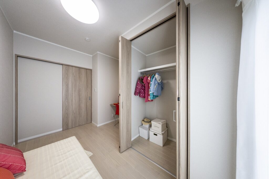 玄関を抜けると、1階には3つの居室が並んでいるの。2つの子ども部屋には奥行きのある壁面クローゼットを完備しているから、成長に合わせて荷物が増えても安心。