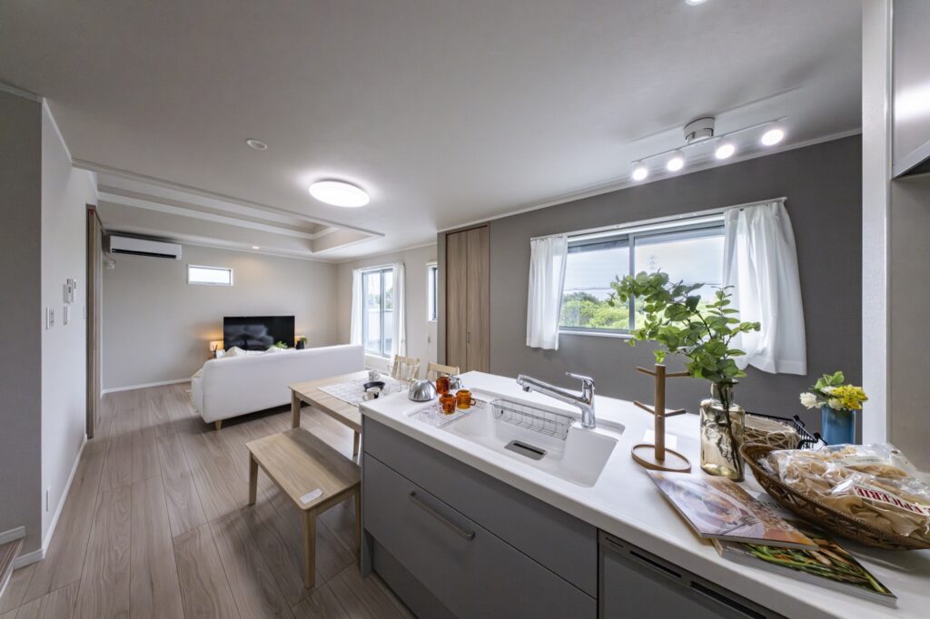 リビングとつながるフルオープンのカウンターキッチンは、開放的で家族の会話もはずむ空間。キッチンスペースは広く取られているから、収納もたっぷり。
