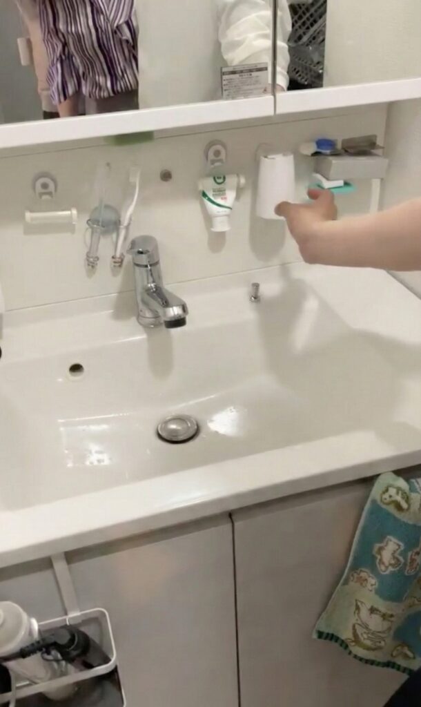 こちらのお家では洗面台奥のパネルに吸盤を使って、歯ブラシや歯磨き粉を「浮かせて」収納されていたわよ。 水切れもいいし、お掃除もしやすそうで清潔を保てそう♪
