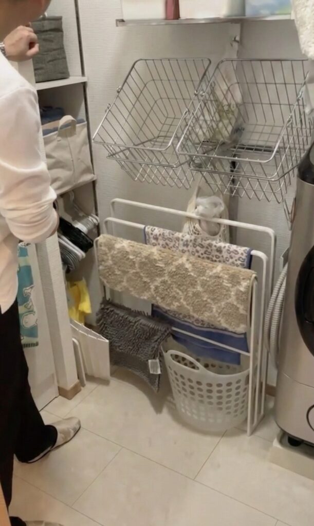 もともとある建付収納に加え、デッドスペースになりがちな洗濯機横の空間まで有効活用されていて、 ハンガーや洗濯かごもスッキリ収納されていたわよ。